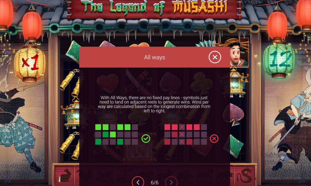 The Legend of Musashi – это 6-барабанный слот с 4096 выигрышными линиями. Игровые комбинации формируются слева направо, начиная с первого барабана. Размер ставок варьируется от 10 до 5000 монет за одно вращение. При выпадении призовых комбинаций символы исчезают, активируя механизм лавины. В игре также есть риск-игра и возможность выиграть до 20000x вашей ставки.