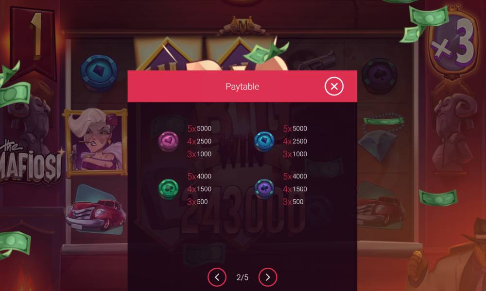 The Mafiosi — это видеослот с сеткой 5×3, которая увеличивается до 5×4 в бонусных раундах. Здесь 243 способа выигрыша, которые в Super Free Spins увеличиваются до 1024. Выигрышные комбинации формируются, если совпадают три и более одинаковых символов на соседних барабанах слева направо. Диапазон ставок выбирается игроком от 20 до 10000 монет. Максимальный выигрыш вас ждет 7000x ставки.