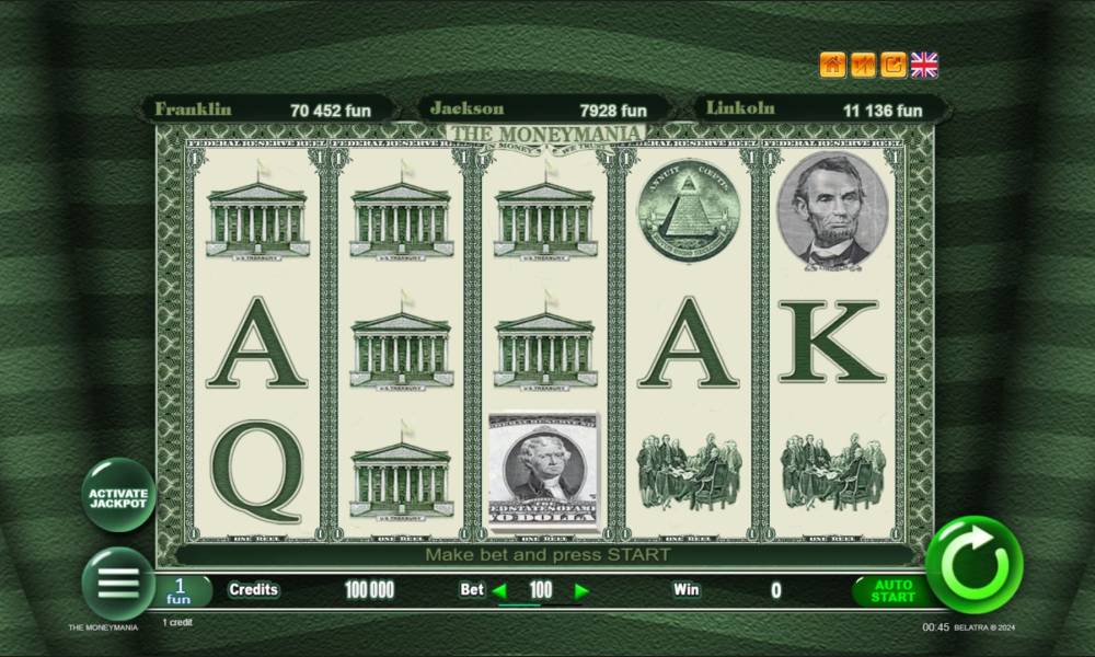 Интерфейс слота The Moneymania можно условно разделить на три части. Первая расположена в правом верхнем углу экрана. Она позволяет настроить звук, языковую версию и выбрать режим графики. Второй является игровое поле с отдельно вынесенной кнопкой для MaxBet, активирующей возможность триггера Колеса Фортуны. Нижняя панель управления отвечает за установку ставки, выбор режима вращений и предоставляет доступ к системным опциям. Там можно найти включение риск-игры, справочную информацию и таблицу выплат.