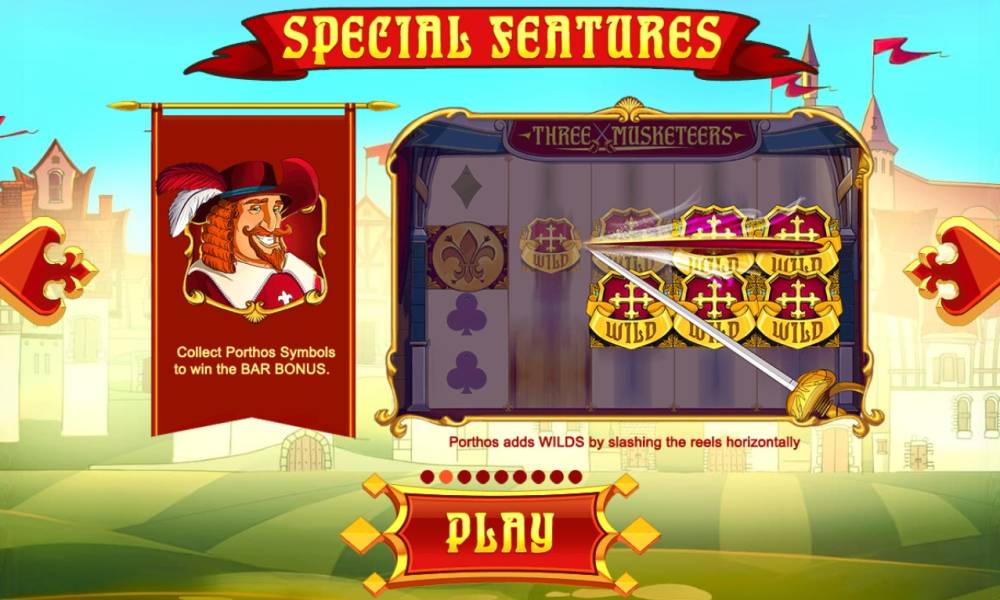 Набор предлагаемых в «Трех мушкетерах» игровых опций состоит из базовых картинок, джокеров и нескольких тематических бонусных розыгрышей.