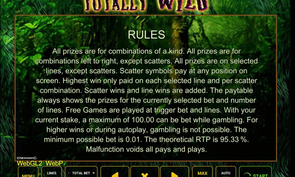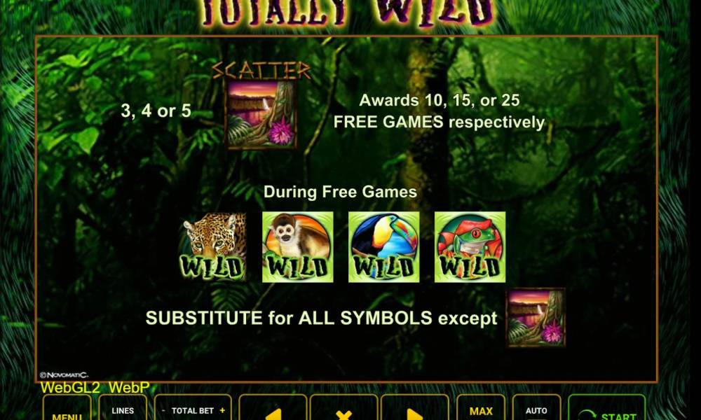 Totally Wild мало чем отличается от десятков однотипных моделей производства компании «Новоматик». Исключение составляют лишь фри-спины с несколькими дополнительными символами Wild. Игроки могут получать бонусы и пользоваться большими выплатами.