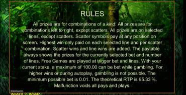 Видеослот Totally Wild наделен средней волатильностью и типичным для Novomatic RTP 95.33%. В совокупности эти два показателя не дадут вам обнулить ваш банкролл за короткий игровой промежуток, а выплаты в базовой игре поддержат ваш денежный баланс гораздо дольше, чем многие другие слоты и предоставят шанс дождаться того единственного спина, который принесет максимальный выигрыш.