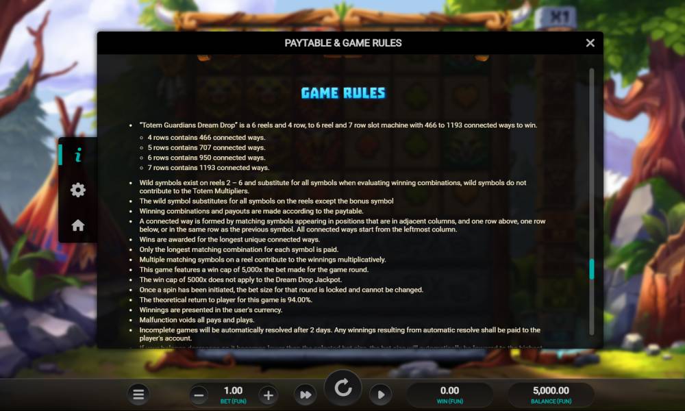 Онлайн слот Totem Guardians Dream Drop дает пользователям возможность выиграть прогрессивный джекпот. Всего их пять — Rapid, Midi, Maxi, Major, Mega. Раунд Dream Drop запускается в рандомный момент перед базовым спином. Чтобы получить один из призов, нужно заполнить столбец джекпота символами DD. Обычные блоки всегда будут удаляться, а знаки DD опускаться вниз и заполнять столбец. Для каждого джекпота барабан имеет свое количество ячеек — 2, 2, 3, 4, 5 соответственно. Максимальная выплата здесь не ограничена 5000 евро и зависит от того, сколько денег было вложено игроками в слот.