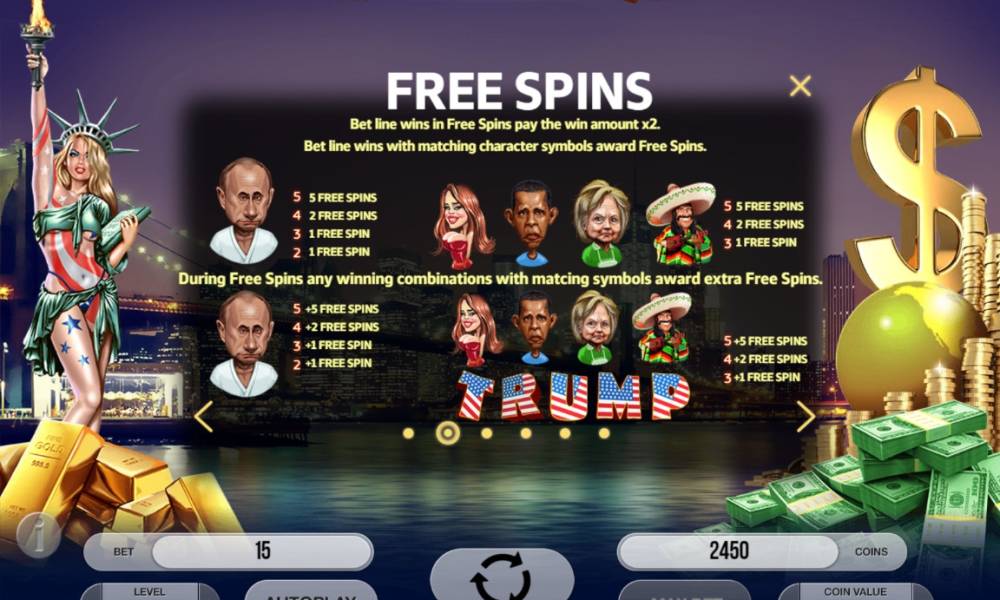Очень необычный автомат особенно своим интерфейсом все знают кто такой Дональд Трамп, что он очень богатый человек и к тому же президент.Так же в автомате присутствует много других президентов стран.