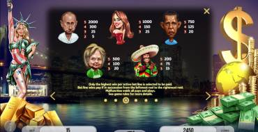 Изюминкой автомата является общая тематика и смешные персонажи,такие как крупнейшие мировые политические деятели: Дональд Трамп, Барак Обама, Ангела Меркель и Владимир Путин. Автомат производит очень хорошее впечатление.