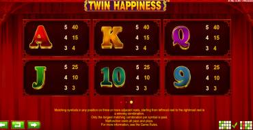 Twin Happiness дает выплаты при появлении одинаковых знаков на 3 барабанах подряд или больше при условии, что они расположатся непрерывно начиная с левого. Высота появления знаков не имеет значения. Всего могут выиграть 243 комбинации. Поле имеет размер 5х3. Ставку можно задать от 0.25 до 250. Валюту определяет казино. Есть 1 бонусная функция с раздвоением барабана.