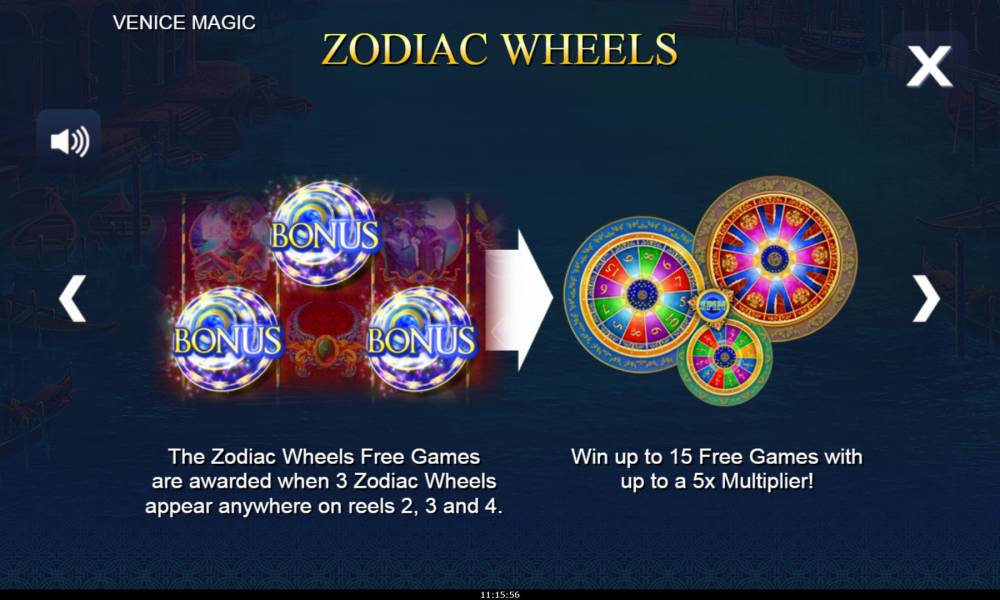 Bonus (вращающиеся барабаны) выпадают на трех средних барабанах. Три бонусных символа начинают бесплатные вращения The Zodiac Wheels.