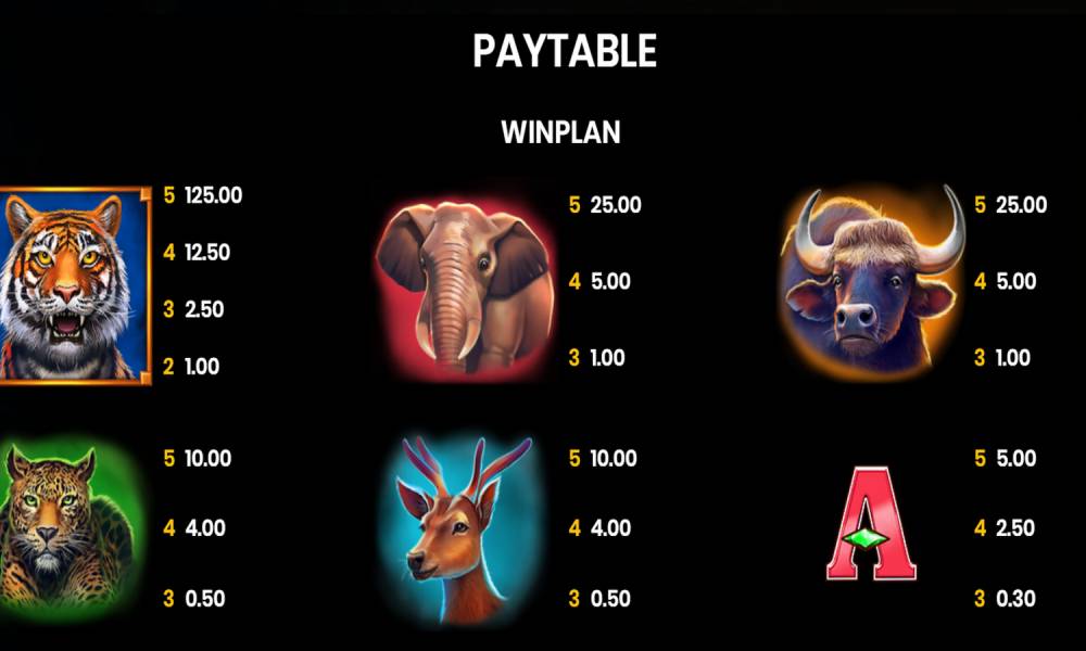 Игровой автомат имеет сетку 5×4. На поле появляются животные и карточные обозначения. Игра использует 5 старших и 6 младших символов. Самый дорогой тигр приносит выплату от 2 штук, а все остальные знаки — от 3. Выигрышные комбинации складываются с первого барабана подряд. Линий для выплат фиксировано 40. В онлайн-слоте можно купить или выиграть фриспины, увеличить приз с помощью множителей и сорвать крупный куш (максимум 250000 евро или эквивалент в другой валюте). В игре предусмотрены интересные бонусные функции и раунды с разной дисперсией. Диапазон ставок на спин широкий — 0.2-200 евро. Так что каждый пользователь сможет ставить посильнее суммы.