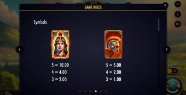 В видеослоте Ways of Athena представлено 5 барабанов в 3 ряда с разным количеством выигрышных линий – от 243 до 43 923, в зависимости от ситуации на игровом поле. Счетчик путей выплат расположен над барабанами. Выигрыш засчитывается при последовательном выпадении одинаковых символов в направлении слева направо, счет ведется от крайнего левого барабана. Количество линий выплат зависит от символа Matching Mystery, который рандомно появляется на всех барабанах, кроме 1-го, при этом превращая символы, совпадающие с символами с первого барабана, в двойные и давая 2 способа выплаты на каждый символ. Диапазон ставок – 0.20 до 100 евро. Появление 3 и более одноименных символов (для Wild – 5 штук) дает возможность применить к ставке множитель. Размеры множителей можно узнать из таблицы выплат. Максимальное умножение х5 к ставке сулит выпадение 5 символов Афины, а также 5 вайлд.