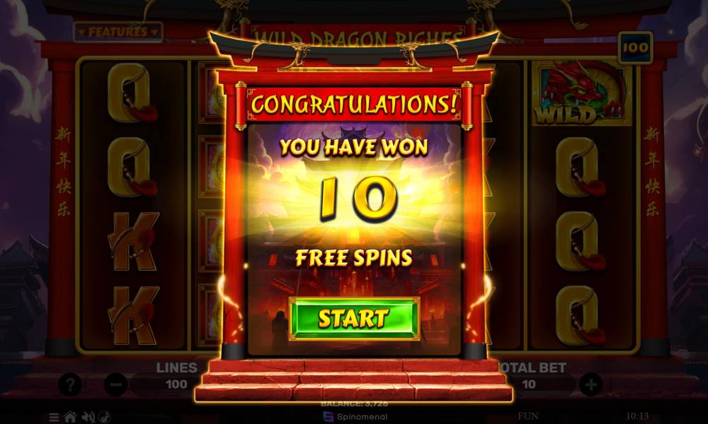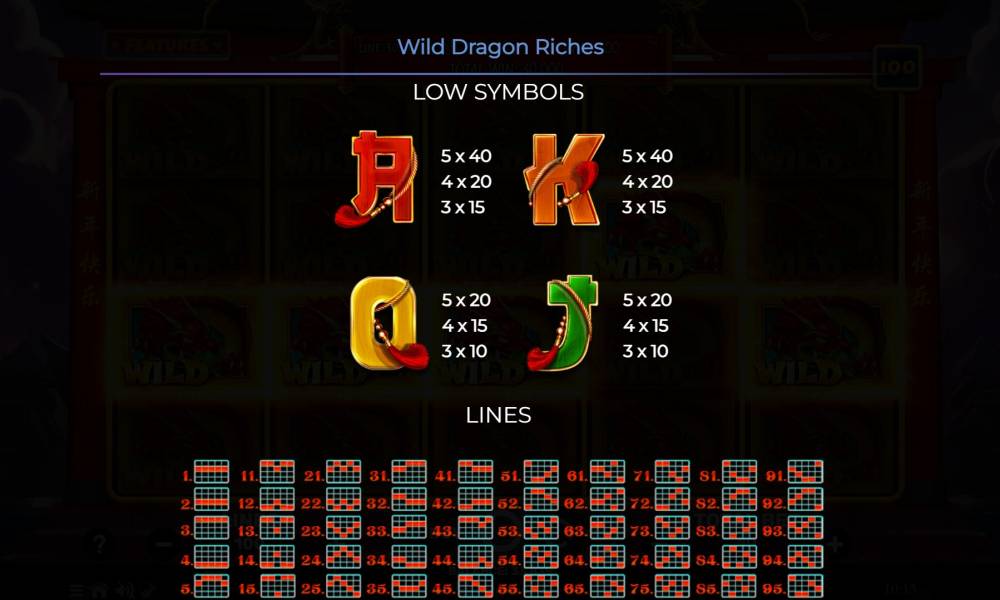 Wild Dragon Riches — это слот с игровым полем 5x4. Игрок может выбирать количество активных линий выплат, начиная от 10 и до 100. В слоте представлено 8 рядовых и 2 специальных символа. Выигрышные комбинации формируются слева направо из 3 и более одинаковых знаков подряд. Символ Wild помогает в создании комбинаций, заменяя другие элементы. Фриспины сопровождаются бонусной механикой: в каждом их раунде появляется минимум 1 Stacked Wild, что значительно увеличивает шансы на выигрыш. Ставка варьируется от 0.1 до 1000 евро за вращение. Начинающим игрокам стоит учитывать, что увеличение количества линий выплат автоматически повышает сумму ставки.