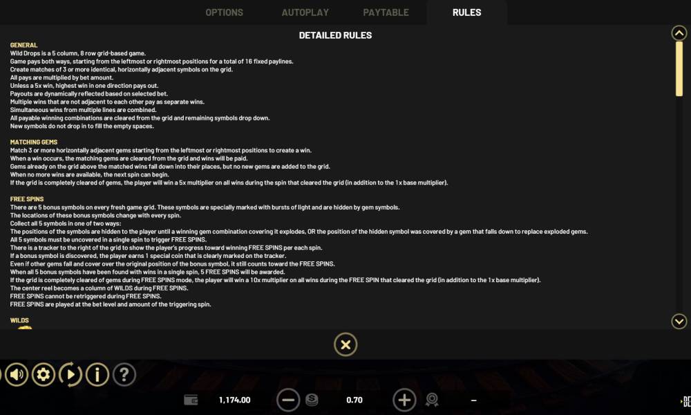 Игровой аппарат Wild Drops от провайдера Betsoft имеет неклассическое поле, состоящее из сетки 5х8. Выплаты производятся по системе Cluster Pays.