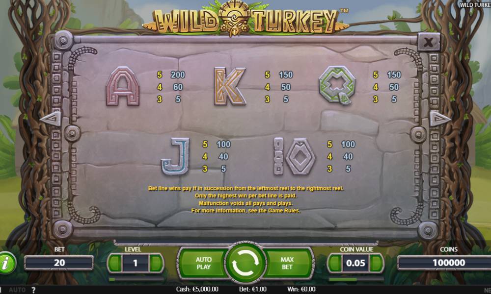 В видео-слоте Wild Turkey пять барабанов и двадцать линий (можно активировать не все). На каждую линию принимается ставка в одну-десять монет номиналом от одного до пятидесяти центов. Таким образом, играть на игровом автомате можно по максимальной ставке в сто евро.