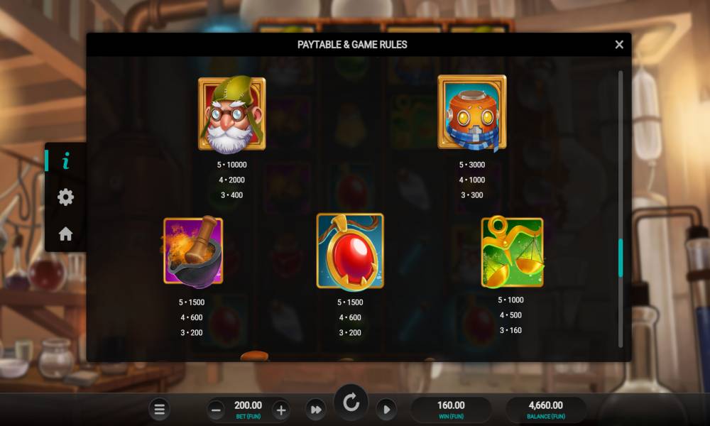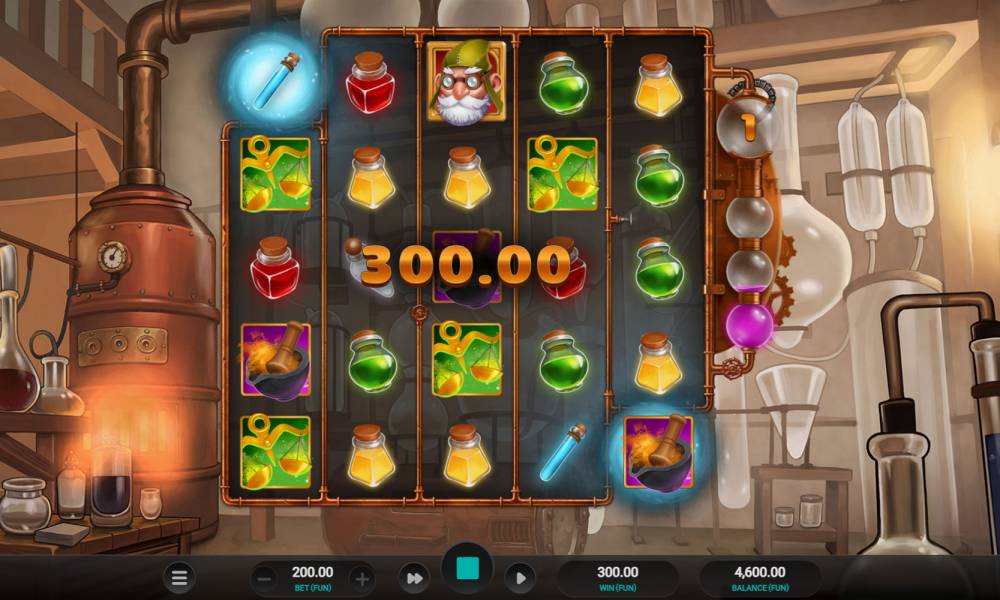 В аппарате Wildchemy интересно все — символы, порталы, фриспины, дикие знаки. Создавать реагенты и реактивы здесь сможет каждый. А если быть примерным учеником, то можно со временем нахимичить себе хорошую сумму на счету.
