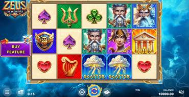 У слота крупное поле, которое хорошо различимо на фоне заднего плана. Слева от поля находится кнопка Buy Feature. Над полем появляются надписи с основными правилами. Все элементы интерфейса находятся внизу. В правом углу — баланс, кнопка для включения-выключения звука и блок Win, где появляется информация о полученной только что выплате. Слева — кнопки меню и выбора ставки. В меню есть 3 раздела — таблица выплат, настройки и правила слота. По центру есть 3 кнопки: настройки и запуск автовращений (A), ручной запуск барабанов (самая крупная кнопка, выделенная огненной рамкой) и ускорение/замедление вращений (на этой кнопке нарисован заяц). Кнопка для запуска риск-раунда появляется на месте кнопки ускорения/замедления барабанов. Для комфортной игры в Zeus the Invincible из своего опыта я рекомендую: